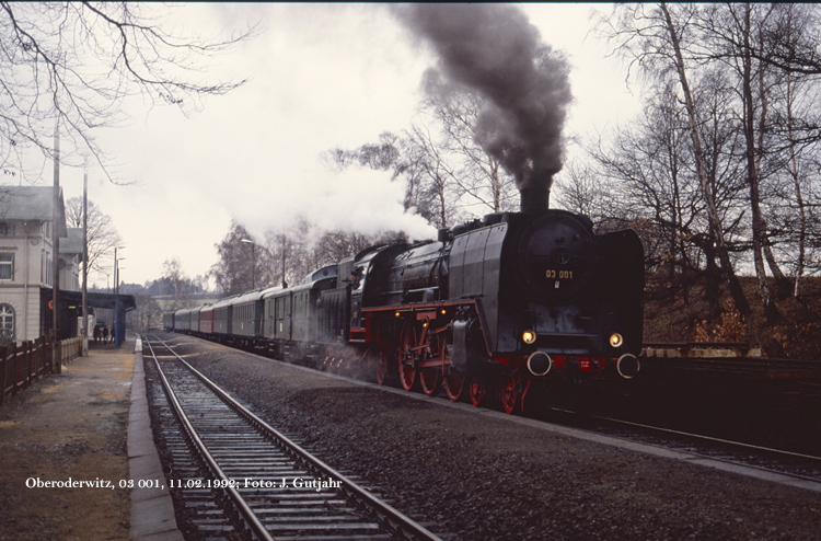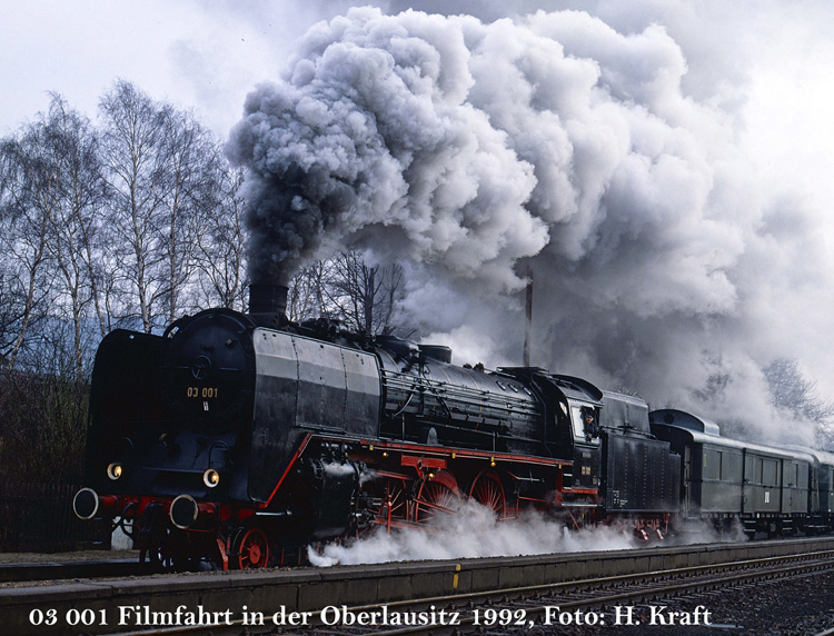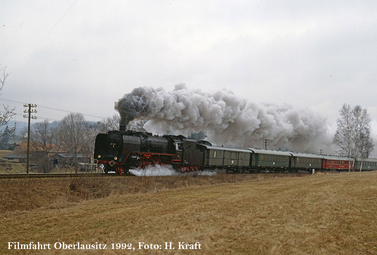 Im Februar 1992 war die mächtige und eindrucksvolle Lok mit einemDR Zug für das damalige filmteam des EK Verlages in der Oberlausitz unterwegs. Horst Kraft und Joachim Gutjahr waren auch vor Ort und dokumentierten fotografisch das Geschehen.