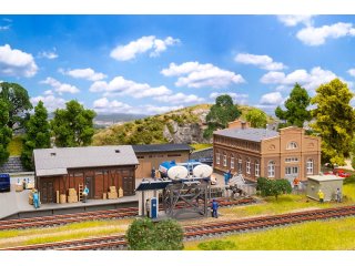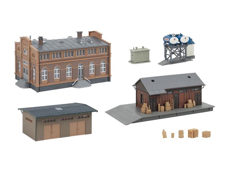 Inhalt: Verwaltungsgebäude, Lagerhalle, Güterschuppen, Dieseltankstelle, Trafohäuschen, Ausgestaltungselemente wie Fässer, Paletten, Kisten, Säcke