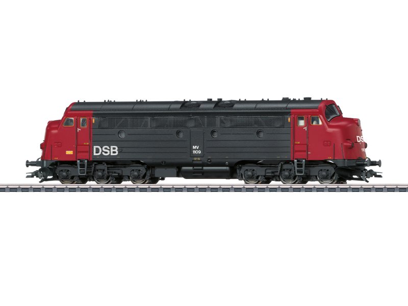 Vorbild: Diesellokomotive Reihe MV der Dänischen Staatsbahnen (DSB). NOHAB-Mehrzweckmaschine in schwarzer und roter Farbgebung der Epoche IV. Betriebsnummer 1109. Betriebszustand um 1983.
