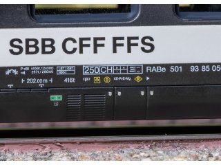 Vorbild: Elektrischer Hochgeschwindigkeits-Triebzug EC 250 als RABe 501 Giruno der Schweizerischen Bundesbahnen (SBB). 1 Endwagen A (Bt1), 2. Klasse. 1 Mittelwagen F (B7), 2. Klasse, mit behindertengerechten Einstiegen und Stromabnehmer. 1 Mittelwagen G (WR6), mit Restaurant-Bereich. 1 Mittelwagen H (A5), 1. Klasse, mit Behinderten-Einstiegen und Stromabnehmer. 1 Endwagen L (At2), 1. Klasse. Mehrsystem-Triebzug. Nachbildung des EC 151, mit grenzüberschreitendem Zuglauf: Frankfurt/Main - Freiburg - Basel - Zürich - Milano Centrale. Zug-Nummer RABe 501 022, mit Wappen des Kantons Vaud. Betriebszustand um 2024.