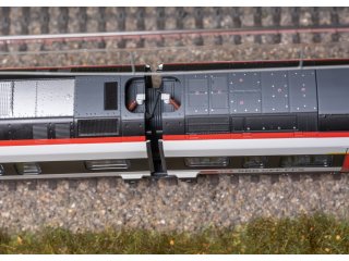 Modell: 5-teilige Grundgarnitur. Restaurantwagen G und die beiden links und rechts angeordneten Mittelwagen F und H sind über die Jakobs-Drehgestelle fest miteinander gekuppelt. Mit Digital-Decoder mfx+ und umfangreichen Geräusch- und Lichtfunktionen. Geregelter Hochleistungsantrieb mit Schwungmasse im Restaurantwagen zentral eingebaut. Alle 4 Achsen in beiden Jakobs-Drehgestellen links und rechts des Restaurantwagens über Kardan angetrieben. Haftreifen. Führerstände der Endwagen mit Inneneinrichtung. Fahrtrichtungsabhängige Stromversorgung über den jeweils vorderen Endwagen. Kulissenführung in den Jakobs-Drehgestellen. Fahrtrichtungsabhängig wechselndes Dreilicht-Spitzensignal und zwei rote Schlusslichter, konventionell in Betrieb, digital schaltbar. Umschaltbar auf ein weißes Schlusslicht (Schweizer Lichtwechsel). Weitere separat schaltbare Lichtfunktionen. Serienmäßig eingebaute Innenbeleuchtung. Innenbeleuchtung wird versorgt über die durchgehende elektrische Verbindung des ganzen Zuges. Zusätzlich Führerstand- und Fahrpult-Beleuchtung jeweils separat digital schaltbar. Gesamte Beleuchtung mit wartungsfreien warmweißen und roten Leuchtdioden (LED). Stromabnehmer auf den Mittelwagen F und H jeweils als Digital-Funktion separat heb- und senkbar. Maßstäbliche Nachbildung. Befahrbarer Mindestradius 360 mm. Länge der Grundgarnitur ca. 112 cm.
