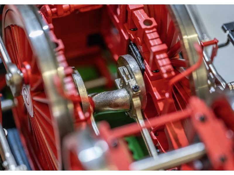 Modell: Weitestgehend aus Metall. Fahrgestell, Lokaufbau mit Kessel und Führerhaus aus Zinkdruckguss. Sonstige Ansetzteile ebenfalls meist aus Metall (MS) gefertigt. Aufwendiges Modell mit vielen angesetzten Details und höchstdetailliertem Führerstand. Rauchkammertür zum Öffnen. Bewegliche Führerstandstüren, u.v.m. Mit mfx-Digital-Decoder mit 32 Funktionen, geregeltem Hochleistungsantrieb und Geräuschgenerator mit radsynchronem Fahrgeräusch sowie umfangreichen Geräuschfunktionen. Betrieb mit Wechselstrom, Gleichstrom, Märklin Digital und DCC möglich. Eingebauter Pufferkondensator. Alle Treibachsen angetrieben. Eingebauter Rauchgenerator mit radsynchronem Dampfausstoß, mehrstufiger Zylinderdampf und Dampfpfeife. Triebwerksbeleuchtung, Dreilicht-Spitzensignal mit epochengerechter Lichtfärbung mit der Fahrtrichtung wechselnd. Stirnbeleuchtung konventionell in Betrieb, digital schaltbar. Beleuchtung mit wartungsfreien warmweißen LEDs. Rotes Zugschlußsignal schaltbar/abschaltbar und Führerstandsbeleuchtung. Digital schaltbare Sonderfunktion: Lokführer betätigt den Regler (mit Servo betätigter Bewegungsablauf wie wenn der Lokführer den Regler im Vorbild betätigt). Ausgerüstet mit Federpuffern, Lokmodell vorn mit Schraubenkupplung, hinten mit fernbedienbarer Telexkupplung ausgerüstet, (hinten gegen Schraubenkupplung tauschbar). Steuerungsumschaltung (Vor-, Rückwärts, Dauerbetrieb) in 3 Stufen. Eingebaute Lokführer- und Heizerfigur.Zum Lieferumfang des Modells gehört ein Ausstattungspaket mit einer Schraubenkupplung, Dampföl und Handschuhen. Montiert auf einem schwarz lackierten Aluminiumsockel für die Vitrinenpräsentation. Befahrbarer Mindestradius 1.020 mm. Länge über Puffer ca. 73,8 cm. Gewicht ca. 9,2 kg.