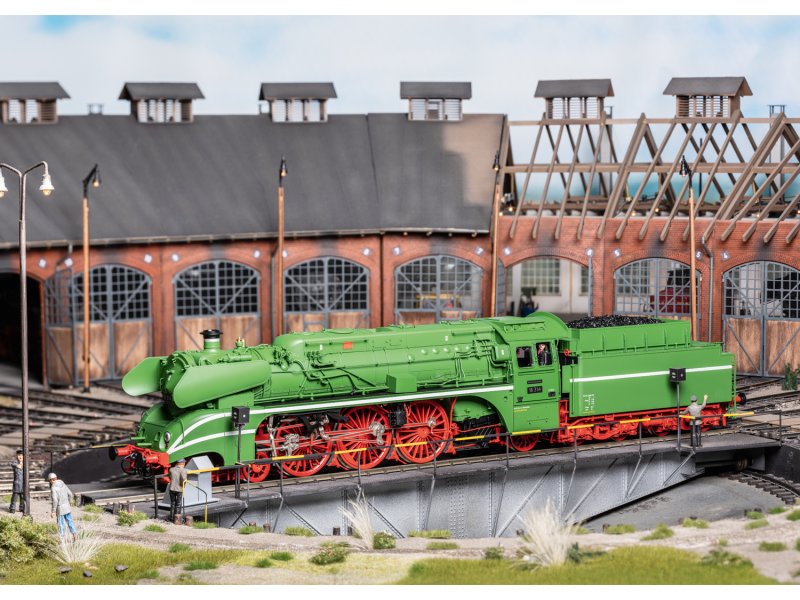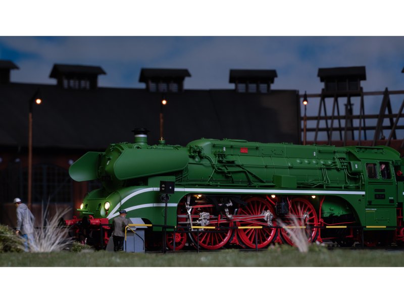 Vorbild: Schnellzug-Dampflokomotive 18 314 mit Kohle-Hauptfeuerung und Kohletender 2´2´T34 der Deutschen Reichsbahn der DDR (DR/DDR). Umbau-Version als Versuchslokomotive der VES-M Halle (Saale). Ausführung mit Reko-Kessel und Teilverkleidung, auf Basis der Dampflokomotive 18 314 (ehemalige badische IV h). Mit Witte-Windleitblechen und einseitigem Indusimagnet. Betriebszustand um 1962/1963.