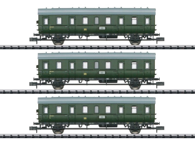 Vorbild: 3 Reisezugwagen 2. Klasse in der Ausführung der Deutschen Reichsbahn der DDR (DR/DDR). 2 Wagen DR B 541 und ein Wagen DR Btr-541 (ehemalige Cd-21b/33) für Reisende mit Traglasten. Betriebszustand um 1964.