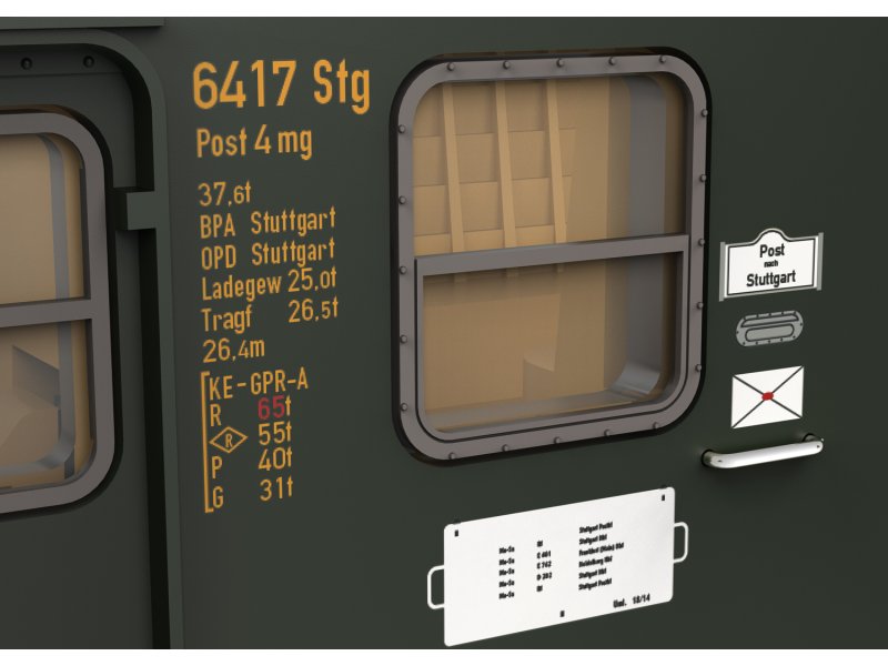 Vorbild: Postwagen der Bauart Post 4mg-bI/26, in der Ausführung der Deutschen Bundespost (DBP) mit dem Wagenlauf Stuttgart-Frankfurt-Heidelberg-Stuttgart.Betriebszustand im Jahr 1963.