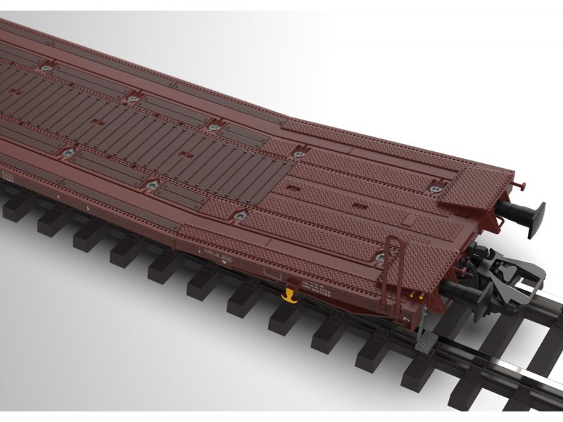 Modell: Beide Flachwagenhälften aus Metall. Viele separat angesetzte Details wie Bremsleitungen, Luftbehälter, Überfahrbleche, Tritte und Bremsgestänge. Pufferhöhe nach NEM. Kinematikgeführte, starre Schraubenkupplung zwischen den Wagenhälften. Haltekeile für die Wagenoberseite, Haltekeile für den Wagenboden und Bremsschläuche liegen als separat ansteckbare Teile bei. Beladen mit vier VW Crafter von der Firma Schuco. Länge über Puffer 32,4 cm. Wechselstromradsatz E413993.