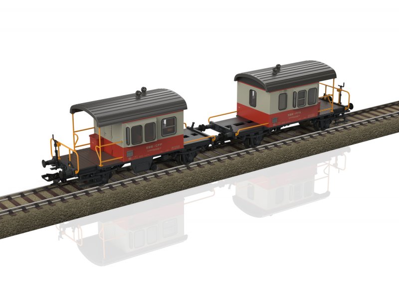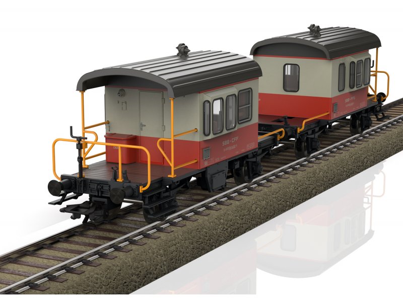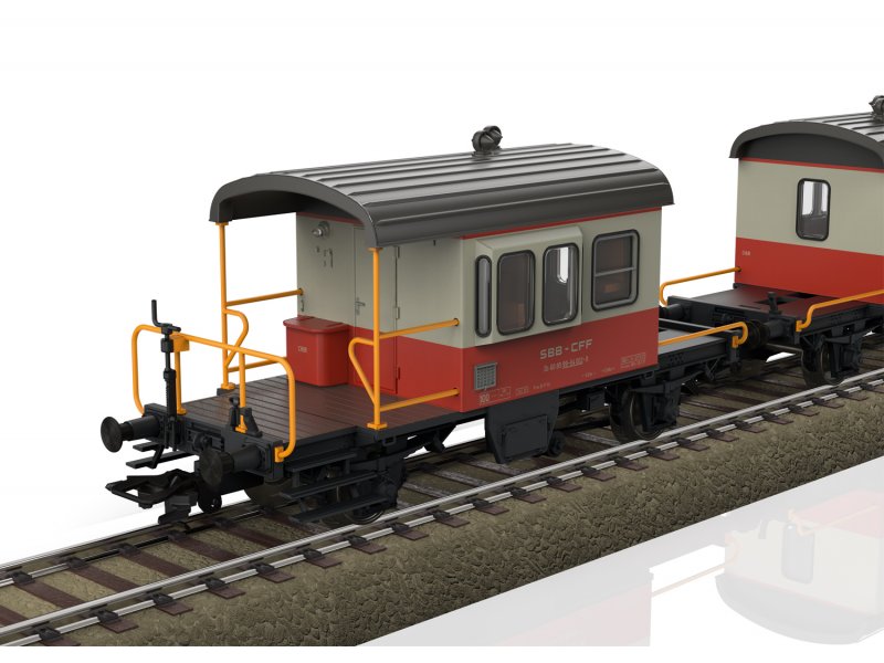 Vorbild: Zwei ehemalige Dienstbegleitwagen Bauart Db der Schweizerischen Bundesbahnen (SBB/CFF/FFS). Kieselgrau/Blutorange Grundfarbgebung im Einsatz als Kuppelwagen des Swiss Express. Betriebszustand ab 1975.