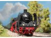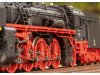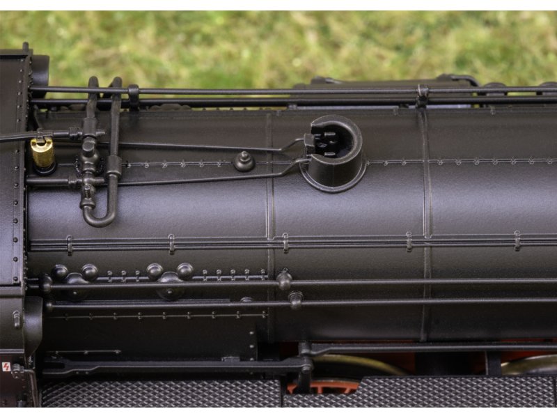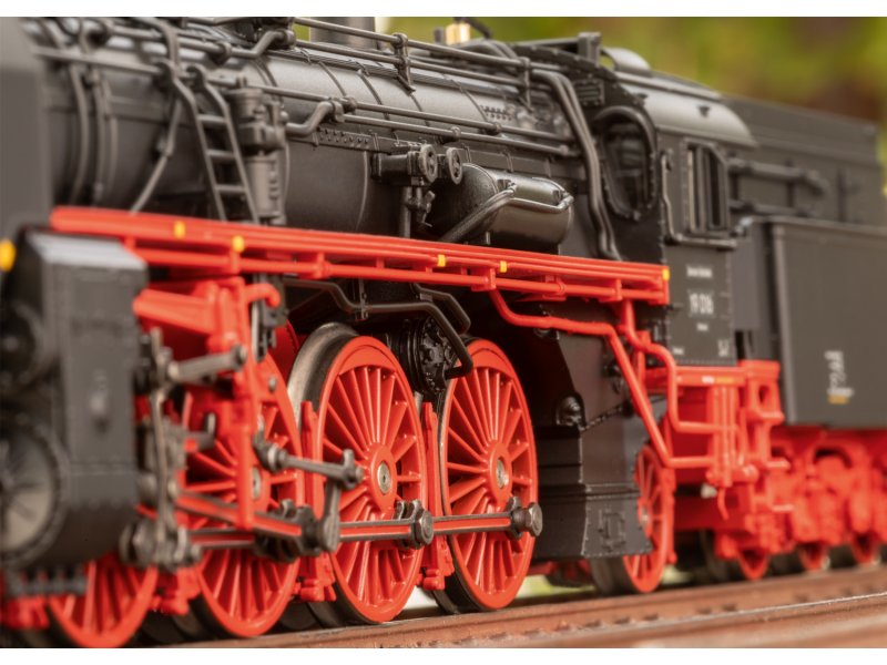 Modell: Mit Digital-Decoder und umfangreichen Geräuschfunktionen. Geregelter Hochleistungsantrieb mit Schwungmasse im Kessel. 4 Achsen angetrieben. Haftreifen. Lokomotive und Tender weitgehend aus Metall. Serienmäßig eingebauter Raucheinsatz, mit geschwindigkeitsabhängigem, dynamischem Rauchausstoß. Fahrtrichtungsabhängig wechselndes Zweilicht-Spitzensignal konventionell in Betrieb, digital schaltbar. Führerstandbeleuchtung und Feuerbüchsenflackern jeweils separat digital schaltbar. Beleuchtung mit wartungsfreien warmweißen und roten Leuchtdioden (LED). Mit Pufferspeicher. Schwenkbare Führerstandtüren und Imitation der Vorhänge zwischen Führerstand und Tender. Kurzkupplung mit Kinematik zwischen Lok und Tender. Am Tender kinematikgeführte Kurzkupplung mit NEM-Schacht. Pufferhöhe an Lok und Tender nach NEM. Befahrbarer Mindestradius R2 437,5 mm. Kolbenstangenschutzrohre und Bremsschläuche liegen bei. Länge über Puffer 26,0 cm.