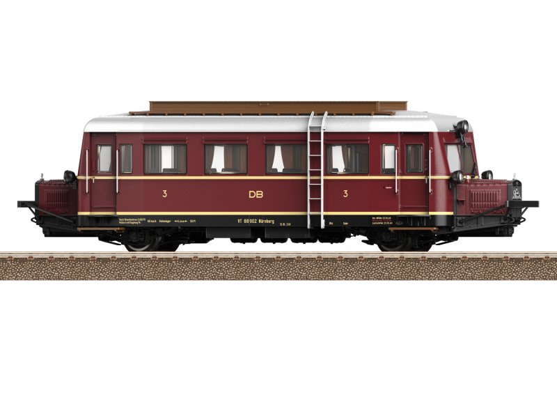Vorbild: Dieseltriebwagen Cvt-34 äWismarer Schienenbus“ (Typ Hannover A) als VT 88.9 der DB. Farbgebung purpurrot. Zustand um 1950. VT 88 902, Nürnberg.
