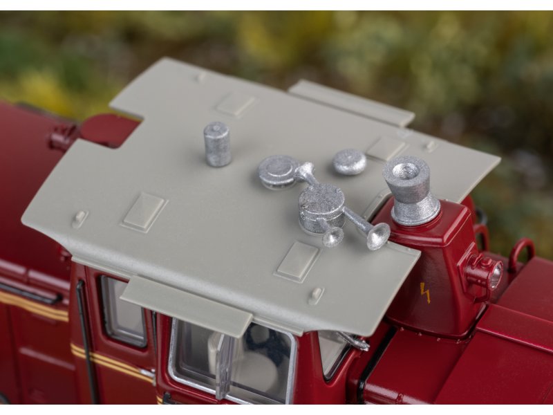 Modell: Mit Digital-Decoder und umfangreichen Geräuschfunktionen. Geregelter Hochleistungsantrieb. Eine Achse angetrieben, zwei Achsen und Blindwelle über Kuppelstangen angetrieben. Haftreifen. Fahrtrichtungsabhängig wechselndes Dreilicht-Spitzensignal und zwei rote Schlusslichter konventionell in Betrieb, digital schaltbar. Führerstandbeleuchtung digital schaltbar. Triebwerkbeleuchtung digital schaltbar. Doppel-A-Licht schaltbar. Beleuchtung mit wartungsfreien warmweißen und roten Leuchtdioden (LED). Mit Pufferspeicher. Telex-Kupplungen vorne und hinten jeweils separat digital schaltbar. Angesetzte Griffstangen und Geländer aus Metall. Länge über Puffer ca. 12 cm.