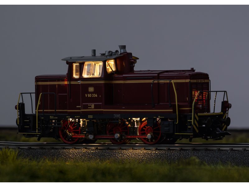 Vorbild: Diesel-Rangierlokomotive Baureihe V 60 der Deutschen Bundesbahn (DB). Purpurrote Grundfarbgebung. Dieselhydraulischer Antrieb mit Blindwelle. Vorbauten und Führerhaus der Serienausführung. Führerhausdach in der Bauform der Loks bis ca. V 60 390. Führerhausdach mit Lüftungsklappen. Erste Form des Schalldämpfers. Dofa-Ofen mit Kohlefeuerung, Kohlebehälter am rechten Umlauf hinter dem Dofa-Ofen. Betriebsnummer V 60 334. Betriebszustand um 1960.