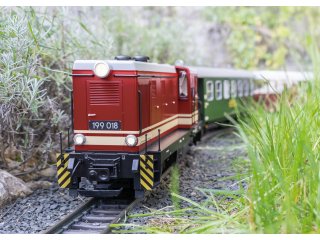 äAuf ins Zittauer Gebirge“. Seit über 130 Jahren kann man eine der schönsten Regionen der Oberlausitz mit einer romantischen Schmalspurbahn entdecken. Neben König Dampf brummt seit 2011 auch eine bestens gepflegte rote-beige Diesellok über die 750-mm-Gleise nach Oybin und Jonsdorf. Sie ist eine kleine Prinzessin neben den urigen Dampfrössern, die dort die meisten Züge fahren. Mit ihrer Leistung von 700 PS stellt sie sogar ihre schwarzen Kollegen in den Schatten. Geboren wurde sie 1973 als eher hässliches Entlein mit der banalen Bezeichnung L45H. 334 Maschinen dieses Typs stellte die rumänische Lokfabrik FAUR vor allem für polnische und rumänische Schmalspurbahnen her. Die heutige 199 018 tat dann – meist in ungepflegtem Zustand und mit technischen Problemen behaftet – bis zur Jahrtausendwende in Siebenbürgen als Lok 87-0029 ihren Dienst. 2010 kam sie schließlich in die Oberlausitz. Die Zittauer Eisenbahner unterzogen die Maschine einer intensiven Verjüngungskur mit einem stärkeren Motor, gaben ihr die Nummer 199 018 und bauten Videokameras in die Frontlampen, damit ein Lokführer für den Betrieb genügt. Wegen der hohen Motorvorbauten mussten die L45H sonst von zweien gefahren werden. In Zittau gehört die 199 längst zum unverzichtbaren Inventar. Eine ähnliche Bereicherung ist das neue LGB-Modell für jeden Gartenbahner – als schmucke Miniatur-Prinzessin neben den gelungen LGB-Dampfrössern.