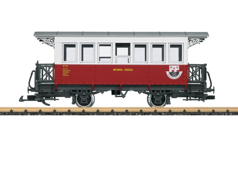 Es war einmal ein deutscher Reichsritter, dem Johann Wolfgang von Goethe den berühmt berüchtigten äSchwäbischen Gruß“ mit der legendären Entblößungsandrohung zuschrieb. Er hieß Götz von Berlichingen und wohnte auf der gleichnamigen Burg im Hohenloher Jagsttal. Jahrhunderte später schrieb diese liebliche Region wieder Geschichte, als 1971 auf der 1901 eröffneten schmalspurigen Jagsttalbahn ein historischer Zugbetrieb mit Dampftraktion eingerichtet wurde. Der fand einen so großen Zuspruch, dass die wenigen noch vorhandenen Personenwagen nicht mehr ausreichten. Daher sah man sich nach passenden alten Fahrzeugen um und wurde in der Schweiz fündig. Im Jahre 1982 konnten von der St. Gallen-Gais-Appenzell-Altstätten-Bahn (SGA) vier uralte Personenwagen erworben werden. Ein besonderes Schmuckstück war der 1904 gebaute Wagen 116, der sich noch weitestgehend im Ursprungszustand befand. Nach der erfolgten Umspurung von 1000 auf 750 mm ergänzte der Oldtimer ab 1984 den vielfältigen Fahrzeugpark im Jagsttal. Mit seinem schmucken rot-weißen Erscheinungsbild brachte er insbesondere mit der grün-rot-schwarz lackierten Dampflok 798.101 (äNicki S.“) stilvolle Farbtupfer auf die dortigen Gleise. Und die Stadt Dörzbach zeigte mit dem Stadtwappen an den Seitenwänden die Verbundenheit mit ihrer Eisenbahn. Aktuell wartet der urige Wagen auf seine Restaurierung. Das neue LGB-Modell zeigt aber zumindest im Kleinen, wie das große Vorbild zum nächsten runden Geburtstag der Bahn in neuem Glanz erstrahlen kann.