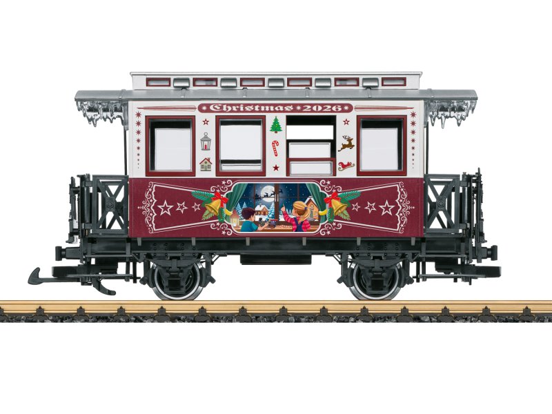 Der Weihnachtswagen 2026 ist mit einem wunderschönen Weihnachts-Motiv aufwendig bedruckt. Türen zum Öffnen, und ergänzt nahtlos die bisherige Reihe der LGB Weihnachtswagen. Metall-Scheibenradsätze. Länge über Puffer 30 cm.