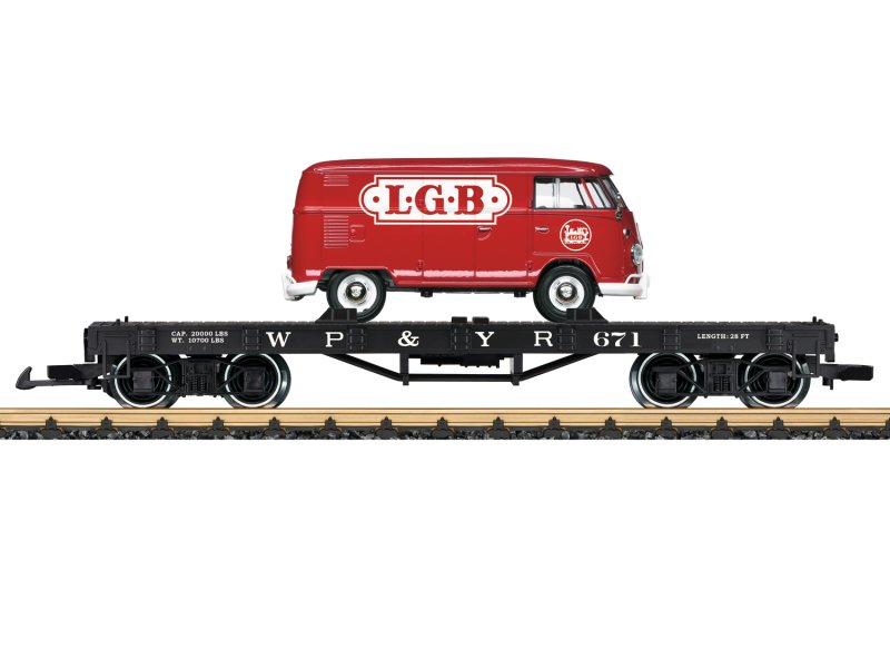 Modell eines Flachwagens der White Pass & Yukon Railroad in Alaska. Originalgetreue Farbgebung und Beschriftung der Epoche III. Beladen mit einem VW-Bus Typ 1 im LGB Design. Metallradsätze. Länge über Kupplung 42 cm.