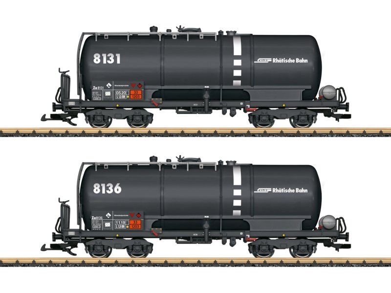 Kesselwagen-Set der RhB der Serie Za. Originalgetreue Farbgebung und Beschriftung der Epoche VI. Betriebsnummer Za 8131 und Za 8136. Der Kessel lässt sich befüllen und entleeren. Metallradsätze. Länge über Puffer pro Wagen 48 cm.