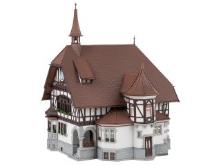 Zweigeschossiges Rathausgebäude nach einem Vorbild in Allmansdorf bei Konstanz mit einem von der Straßenfront zurückgesetzten, überdachten Eingang mit Treppe, einem Erker, einem turmartigen Anbau sowie einem Glockentürmchen. Dunkle Fachwerkelemente in den oberen Geschossen, geschnitztes Ornament und eine Giebeluhr dominieren die Außenfassaden.