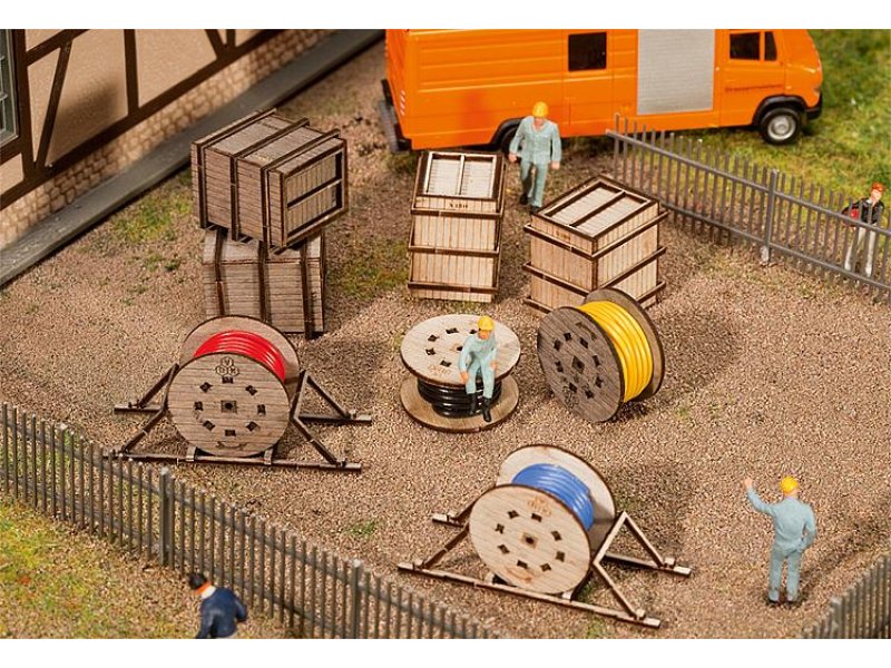 "sehr häufig bei Arbeiten im Bahnbereich anzutreffen. Sehr schönes Ausgestaltungselement, bestehend aus 4 Transportkisten und 4 Leitungsrollen.