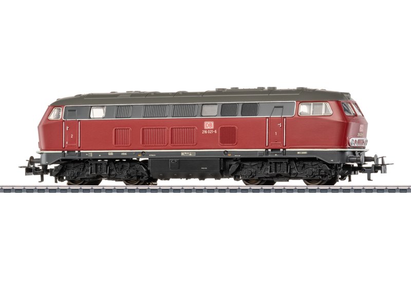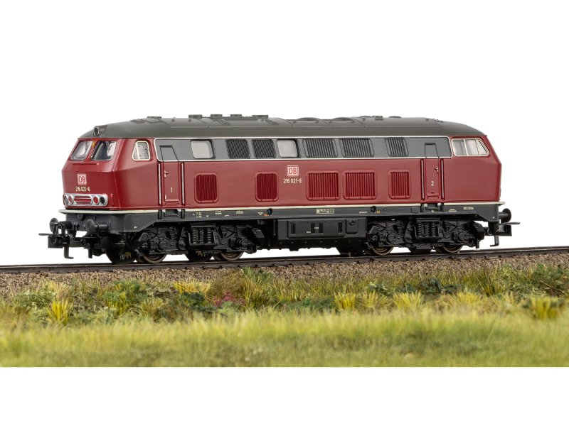 Vorbild: Diesellokomotive Baureihe 216 der Deutschen Bahn AG (DB AG). Ausführung in purpurroter Farbgebung. Betriebszustand um 1995.