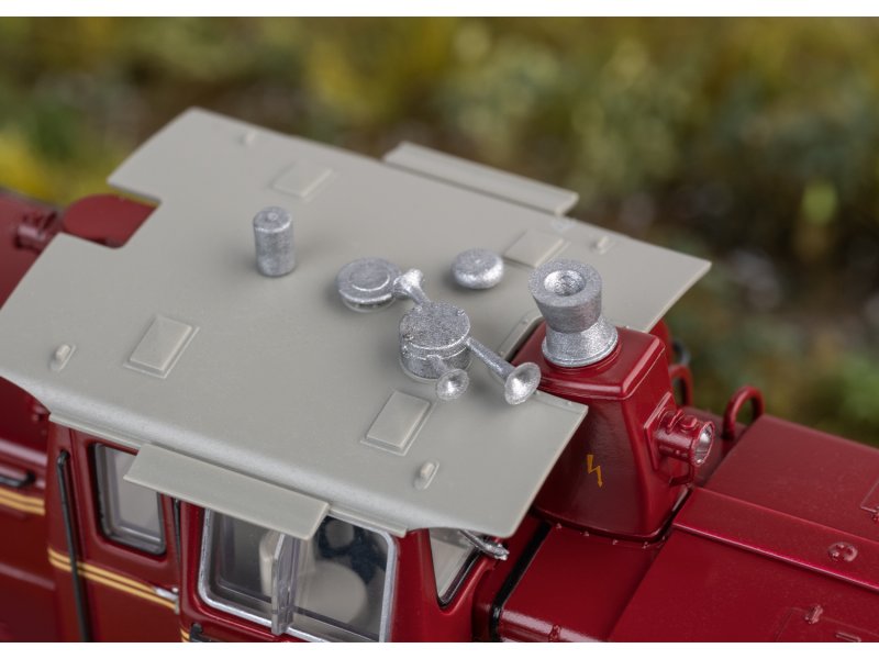 Modell: Mit Digital-Decoder mfx+ und umfangreichen Geräuschfunktionen. Geregelter Hochleistungsantrieb. Eine Achse angetrieben, zwei Achsen und Blindwelle über Kuppelstangen angetrieben. Haftreifen. Fahrtrichtungsabhängig wechselndes Dreilicht-Spitzensignal und zwei rote Schlusslichter konventionell in Betrieb, digital schaltbar. Führerstandbeleuchtung digital schaltbar. Triebwerkbeleuchtung digital schaltbar. Doppel-A-Licht schaltbar. Beleuchtung mit wartungsfreien warmweißen und roten Leuchtdioden (LED). Mit Pufferspeicher. Telex-Kupplungen vorne und hinten jeweils separat digital schaltbar. Angesetzte Griffstangen und Geländer aus Metall. Länge über Puffer ca. 12 cm.