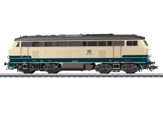 Vorbild: Diesellokomotive Baureihe 218 der Deutschen Bundesbahn (DB). Ozeanblau/Elfenbeinfarbene Grundfarbgebung. Betriebsnummer 218 401-8. Betriebszustand ab 1976.