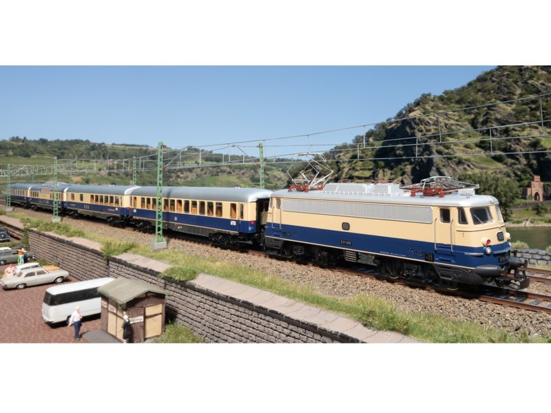 Das passende TEE-Rheingoldwagen-Set Tin Plate zur Elektrolokomotive BR E10.12 finden Sie im Märklin H0-Sortiment unter der Artikelnummer 40852.