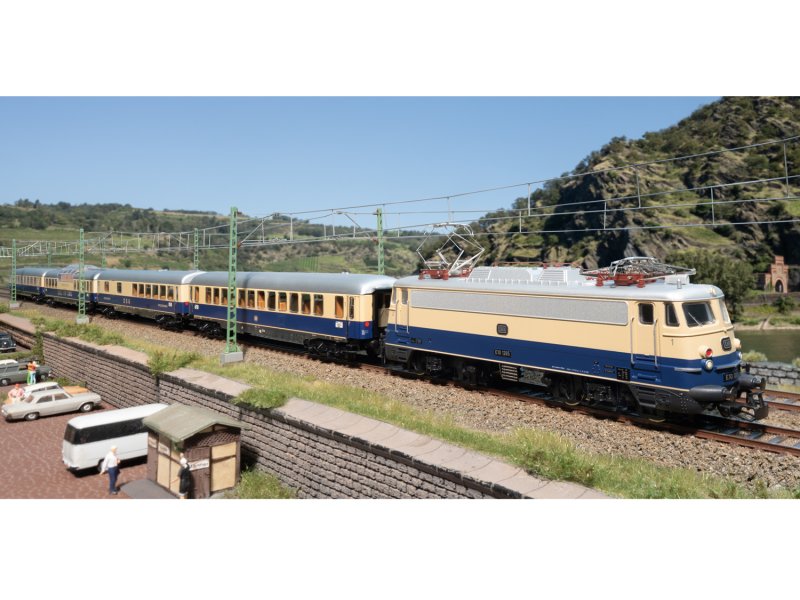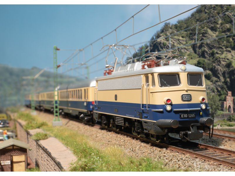 Vorbild: Elektrolokomotive Baureihe E10.12 Bügelfalte der Deutschen Bundesbahn (DB). Kobaltblau/beige Grundfarbgebung, als Rheingold-Lokomotive. Ausführung mit 5 Stirnlampen, durchgehendem Lüfterband mit abgerundeten Enden, umlaufender Regenrinne sowie Pufferverkleidung und Schürze. Lok-Betriebsnummer E10 1265. Betriebszustand um 1962/63.