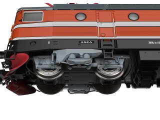 Vorbild: Elektrolokomotive Rc 5 der Schwedischen Staatsbahnen (SJ). Ausführung in oranger Grundfarbgebung mit Scherenstromabnehmern. Betriebszustand ab 1990.