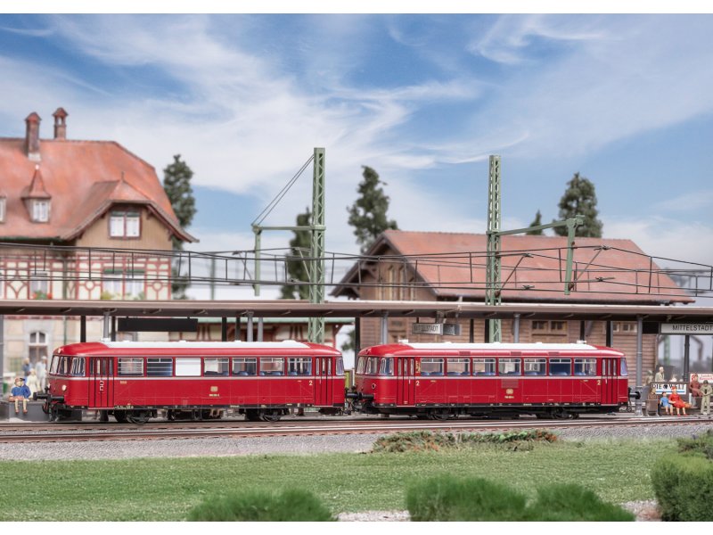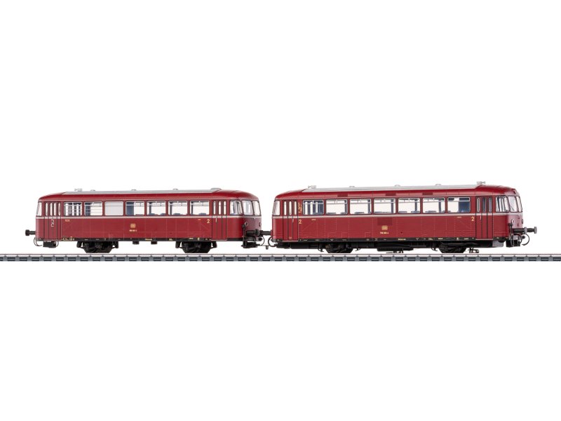 Modell: Motorwagen mit Digital-Decoder mfx+ und umfangreichen Geräusch- und Lichtfunktionen. Geregelter Hochleistungsantrieb. 2 Achsen angetrieben. Haftreifen. Serienmäßig eingebaute Innenbeleuchtung. Fahrtrichtungsabhängig wechselndes Dreilicht-Spitzensignal und 2 rote Schlusslichter, zusammen mit der Innenbeleuchtung konventionell in Betrieb, digital schaltbar. Spitzenlicht am Motorwagen je Seite jeweils separat digital abschaltbar. Steuerwagen mit serienmäßig eingebauter Innenbeleuchtung. Auf der Steuerseite fahrtrichtungsabhängig wechselndes Dreilicht-Spitzensignal mit 2 roten Schlusslichtern. Beleuchtung mit wartungsfreien warmweißen und roten Leuchtdioden (LED). Mit Pufferspeicher. Zwischen den Fahrzeug-Einheiten stromführende Kupplungsdeichsel-Verbindung mit Kulissenführung. Stromführende Kupplungsdeichsel und Bremsschläuche liegen bei. Beide Fahrzeug-Einheiten sowie der optional erhältliche Beiwagen mit freiem Durchblick bei den Führerständen und im Fahrgastraum.Länge über Puffer der zweiteiligen Garnitur 32,2 cm.