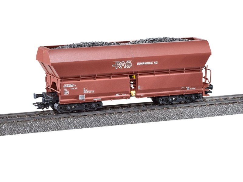 Vorbild: 4-achsiger, großräumiger, offener Selbstentladewagen Bauart Fals. Privatwagen der RAG Ruhrkohle AG. Eingesetzt zum Transport von nässeunempfindlichen Schüttgütern. Rotbraune Grundfarbgebung. Mit Handbremsbühne an einem Wagenende. Drehgestelle der Bauart 665. Betriebszustand um 1991.