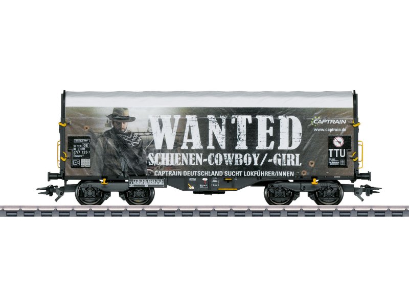 Vorbild: Kurzer, vierachsiger Schiebeplanenwagen Bauart Shimmns 6 der European Rail Rent GmbH (ERR), vermietet an Captrain. Lichtgraue Plane mit auffälliger Werbegestaltung der Captrain Deutschland GmbH. Tiefschwarze Grundfarbgebung der Stirnwände. Betriebszustand ab 2018.