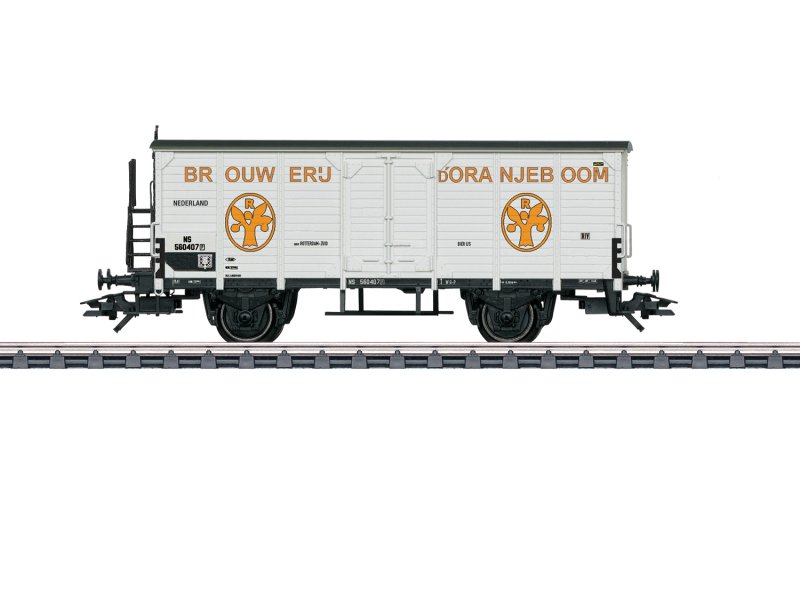 Vorbild: Zweiachsiger gedeckter Bierkühlwagen mit hochgestelltem Bremserstand. Privatwagen in der Gestaltung "Brouwerij D´Oranjeboom", eingestellt bei den Niederländischen Eisenbahnen (NS). Betriebszustand der Epoche III.