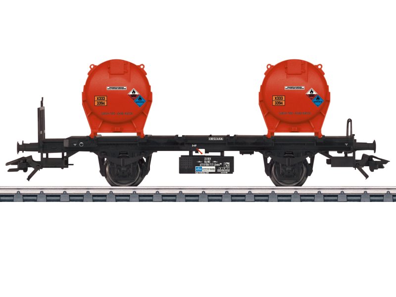 Modell: Mit Bremserbühne und angesetzter Anschriftentafel. Beladen mit zwei Gefahrgutbehältern. Halteklammern zur Fixierung der Behälter liegen bei. Länge über Puffer 11,4 cm. Gleichstromradsatz E700580. Trix-Express-Radsatz: E33357811.