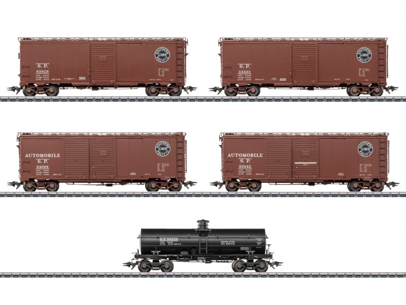 Vorbild: Set bestehend aus fünf US-Güterwagen unterschiedlicher Bauarten der Southern Pacific. Zwei Single-Door Boxcars, zwei Double-Door Boxcars (Automotive Car) und ein Tankcar. Betriebszustand um 1948.