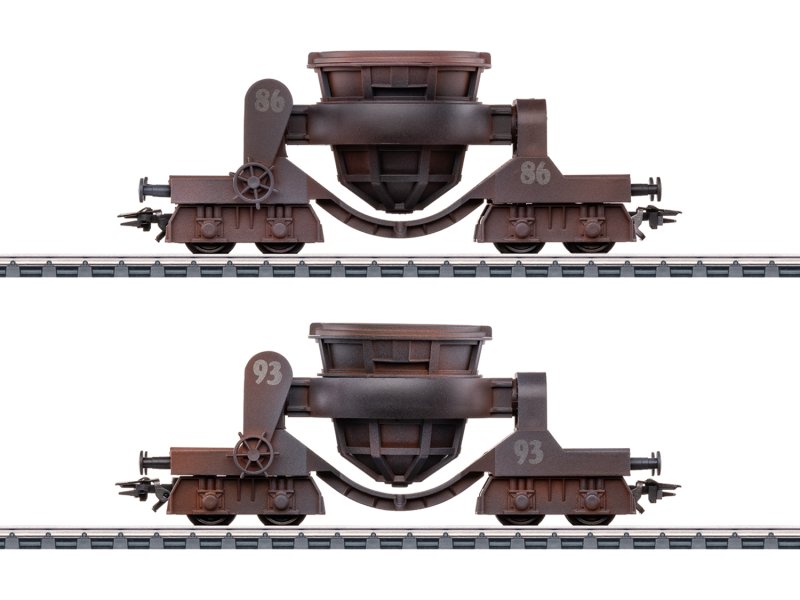 Modell: Rahmen aus Metall. Pfanne seitlich kipp- und abnehmbar. Farbgebung mit authentischen Betriebsspuren. Beide Wagen einzeln verpackt in zusätzlicher Umverpackung. Länge über Puffer je Wagen 10,8 cm.