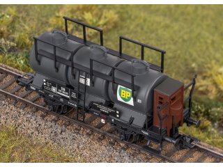Modell: Drei Kesselwagen mit zwei Radsätzen und mit je drei Behältern in detaillierter Ausführung mit unterschiedlichen Betriebsnummern. Zwei Wagen mit Handbremse und Bremserbühne ohne Bremserhaus und ein Wagen mit Handbremse und Bremserbühne mit Bremserhaus. Detailliertes Fahrgestell mit durchbrochenem Rahmen. Detailliert nachgebildete und separat angesetzte Handbremskurbel, Bremsanlage und Entleerungsrohre. Angesetzte Arbeitsbühne mit Aufstieg. Angesetzte Bremserbühne, ohne und mit angesetztem Bremserhaus. Mit kulissengeführten Kurz-Kupplungen. Jeder Wagen in gekennzeichnetem Karton einzeln verpackt.Länge über Puffer je Wagen ca. 10,1 cm. Gleichstromradsatz E700580.