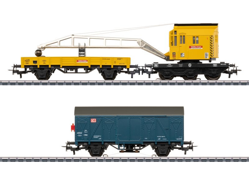 Modell: Kranwagen mit eingebauten Mini-Getriebemotoren und einem Digital-Decoder mfx in Sonderausführung, zur digitalen Steuerung des Krans. Kranschutzwagen mit Auslegerstütze zur Auflage des Kranauslegers. Der Schleifer zur Stromaufnahme ist am Kranwagen montiert. Dies ermöglicht, dass der Kranschutzwagen auch vom Kranwagen abgekuppelt werden kann. Ebenfalls im Set enthalten, ist ein Gerätewagen im klassischen Ozeanblau mit eingebauter roter Zugschlusslaterne. Relex-Kupplungen. Gesamtlänge über Puffer 32,3 cm.