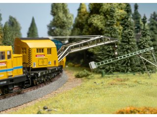 Vorbild: Kranwagen mit Kranschutzwagen und einem Gerätewagen mit eingebauter roter Zugschlusslaterne in fiktiver Gestaltung der Deutsche Bahn Gleisbau GmbH (DBG) im Betriebszustand ab 2006.Für Az-Dienste (Az = Arbeitszug) im Nahbereich verwendete die DBG - ein Tochterunternehmen der Deutschen Bahn AG - auch im Jahre 2006 noch altbewährte, ja fast schon nostalgische Kranbauzüge inklusive dazugehöriger Gerätewagen mit einer klassischen, rot leuchtenden Zugschlusslaterne. Diese Leistungen wurden ab 2006 von als Baureihe 367 im Bestand der DBG geführten Henschel-Diesellokomotiven des Typs DHG 700 geführt. Diese Lok haben wir unter der Artikelnummer 36702 im Sortiment.