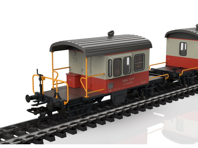 Vorbild: Zwei ehemalige Dienstbegleitwagen Bauart Db der Schweizerischen Bundesbahnen (SBB/CFF/FFS). Kieselgrau/Blutorange Grundfarbgebung im Einsatz als Kuppelwagen des Swiss Express. Betriebszustand ab 1975.