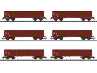 Modell: Vorbildgerechte Nachbildung der Stirnseiten. Die Stirntüren sind im Modell nicht zu öffnen. Separat angesetzte Tritte am Wagenboden. Alle Wagen beladen mit einer Braunkohle-Nachbildung. Alle Wagen mit unterschiedlichen Betriebsnummern. Alle Wagen einzeln verpackt.Länge über Puffer je 16,1 cm. Gleichstromradsatz E700580.