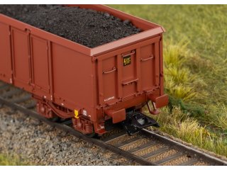 Modell: Vorbildgerechte Nachbildung der Stirnseiten. Die Stirntüren sind im Modell nicht zu öffnen. Separat angesetzte Tritte am Wagenboden. Alle Wagen beladen mit einer Braunkohle-Nachbildung. Alle Wagen mit unterschiedlichen Betriebsnummern. Alle Wagen einzeln verpackt.Länge über Puffer je 16,1 cm. Gleichstromradsatz E700580.