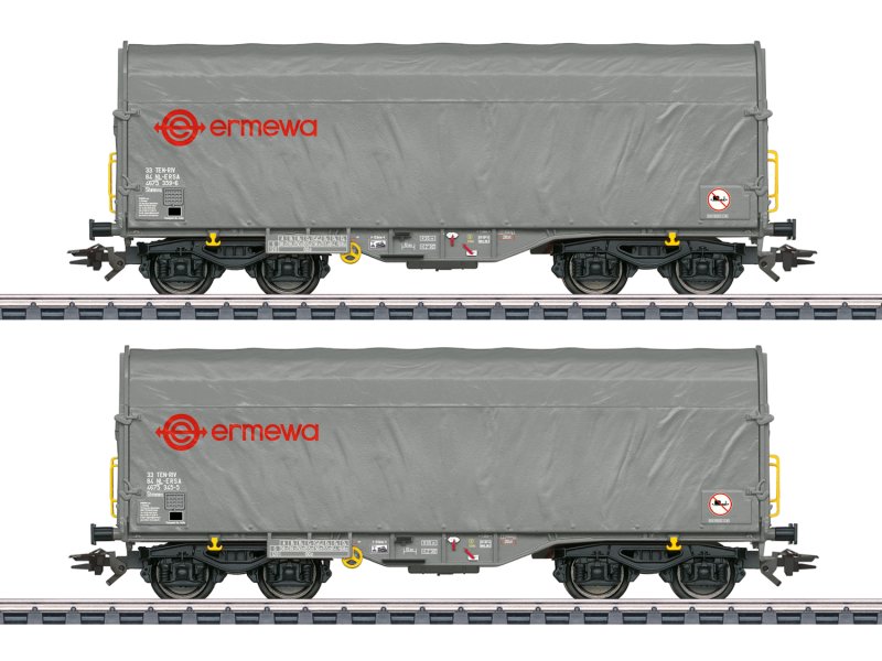 Vorbild: Zwei kurze, vierachsige Schiebeplanenwagen der Bauart Shimmns. Privatwagen der Firma Ermewa SA, registriert in den Niederlanden. Betriebszustand um 2010.