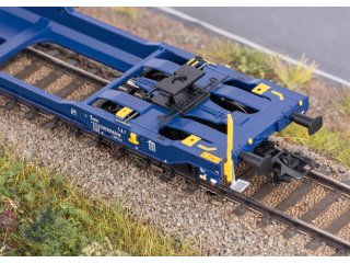 Modell: Beide Tragwagenhälften aus Metall, beweglich gelagert auf dem mittleren Drehgestell. Seitliche Klappriegel ab Werk montiert. Hochklappbar für den Transport von Containern oder Wechselbrücken. Viele separat angesetzte Details wie Tritte, Bremsleitungen und Haltestangen an den Wagenenden. Drehgestelle Bauart Y25. Pufferhöhe nach NEM. Halterungen für Königszapfen in hoher und niedriger Ausführung und Luftkessel für die Wagenenden liegen als separat ansteckbare Teile bei. Beladen mit je einem 20ft. und 40ft. Boxcontainer unterschiedlicher Firmen. Länge über Puffer 39,3 cm.Gleichstromradsatz E700580.