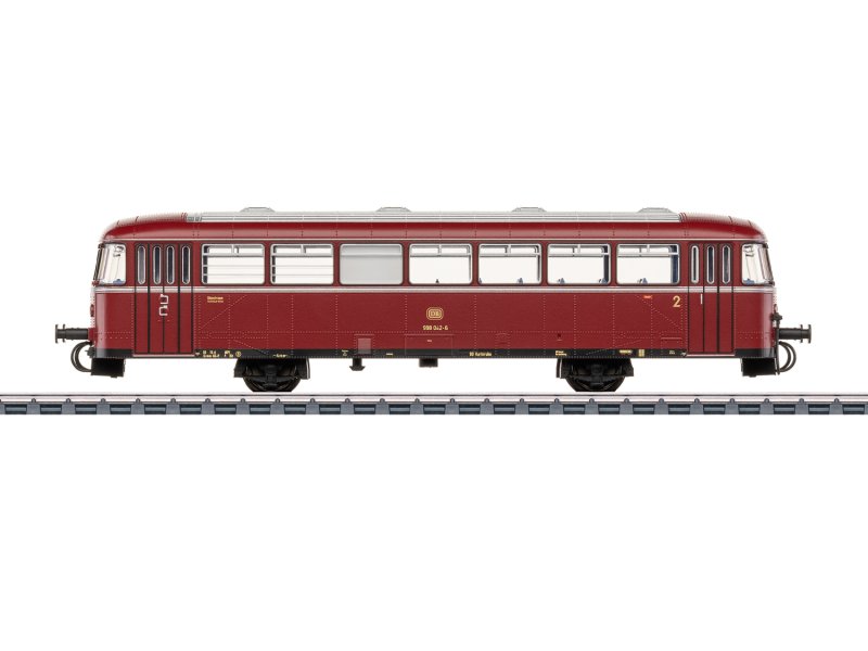 Modell: Beiwagen passend zu der aus Motorwagen und Steuerwagen bestehenden Schienenbus-Garnitur 38980. An beiden Enden kinematikgeführte Aufnahmen für stromführende Kupplungsdeichseln. Eine stromführende Kupplungsdeichsel liegt bei. Wagen-Innenraum mit freiem Durchblick. Inneneinrichtung. Innenbeleuchtung mit wartungsfreien warmweißen Leuchtdioden (LED). Stromversorgung der Innenbeleuchtung über stromführende Kupplungsdeichsel vom Triebfahrzeug. Länge über Puffer 16,0 cm.