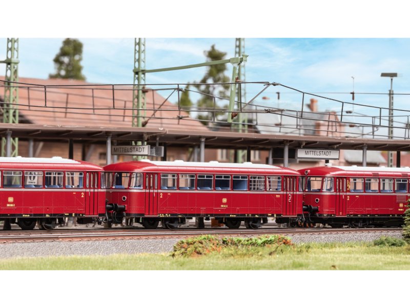 Passende Ergänzung der zweiteiligen Schienenbus-Garnitur aus Motor- und Steuerwagen, die unter der Artikelnummer 38980 erhältlich ist.