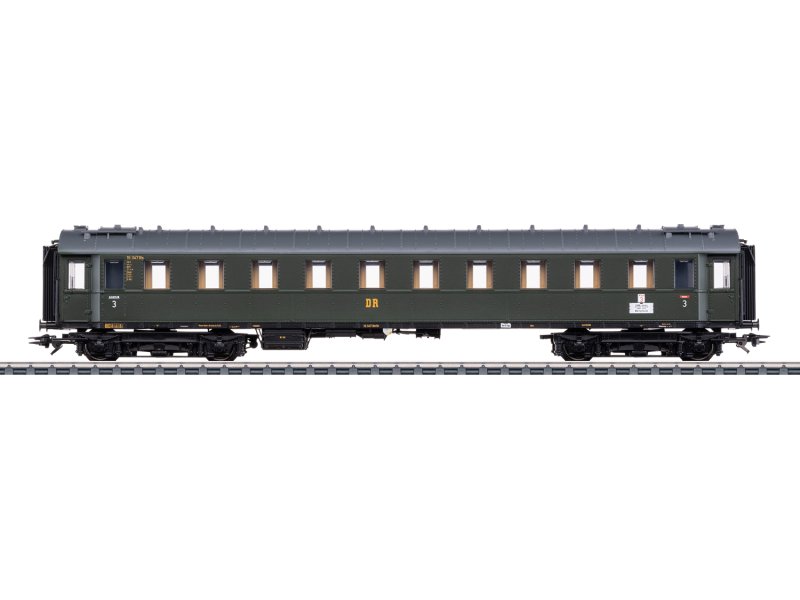 Vorbild: Schnellzugwagen C4ü (C4ü-28), 3. Klasse, Einheitsbauart 1928-30 der Deutschen Reichsbahn der DDR (DR/DDR). Ordnungsnummer 3. Zuglauf für den Schnellzug D 11: Dresden-Warnemünde. Flaschengrüne Grundfarbgebung. Betriebszustand Epoche IIIa, Anfang der 1950er Jahre.