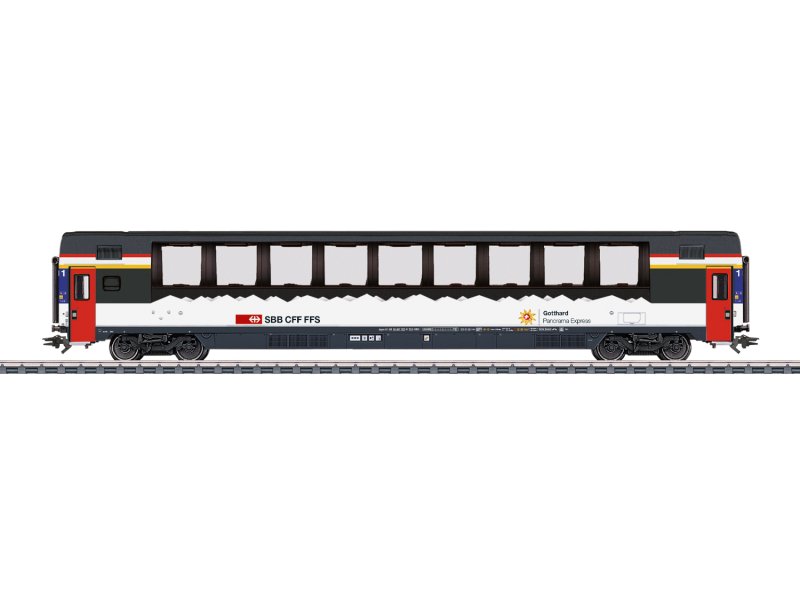 Vorbild: Schnellzug-Panoramawagen Apm, 1. Klasse, der Schweizerischen Bundesbahnen (SBB/CFF/FFS). Betriebszustand 2025.