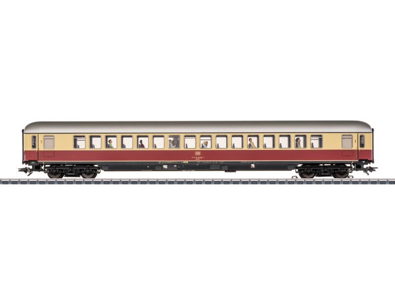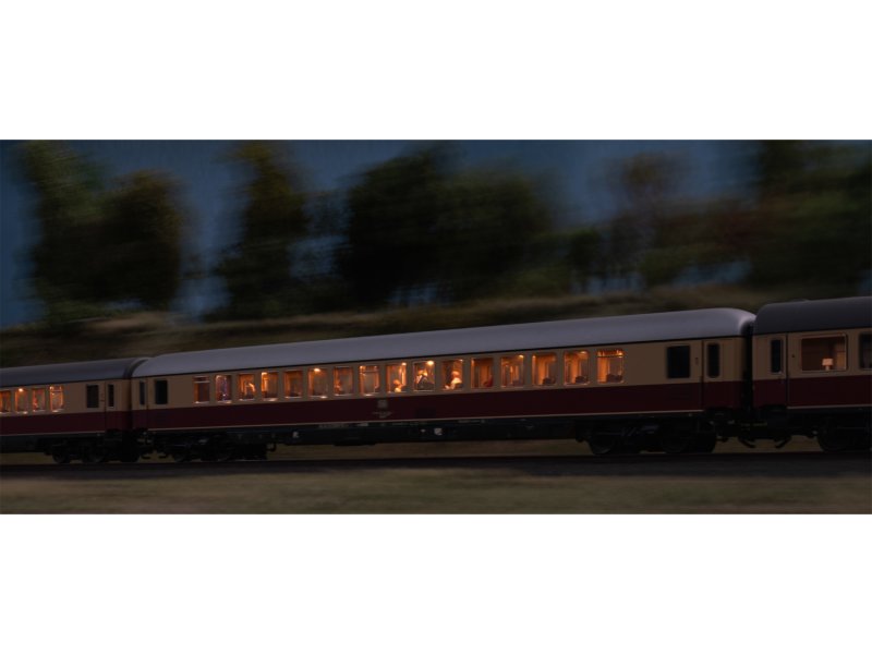 Modell: Mit Digital-Decoder mfx. Mit beweglicher, digital schaltbarer Schaffnerfigur im Mittelgang. Serienmäßig eingebaute LED-Innenbeleuchtung, trennbare stromführende Kupplungen und Zugschlussbeleuchtung am Wagenende 1 und 2 jeweils separat digital schaltbar. Beleuchtung mit wartungsfreien Leuchtdioden (LED). Mit Pufferspeicher. Schleifer ist montiert. Typspezifisch gestalteter Unterboden und Schürze. Mit Drehgestellen nach Bauart Minden-Deutz schwer, vorbildentsprechend mit Scheibenbremsen, Magnetschienenbremse und angesetzten Generatoren. Inneneinrichtung mit Figuren. Gesamtlänge über Puffer 28,2 cm.