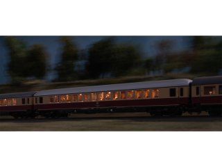 Modell: Mit Digital-Decoder mfx. Mit beweglicher, digital schaltbarer Schaffnerfigur im Mittelgang. Serienmäßig eingebaute LED-Innenbeleuchtung, trennbare stromführende Kupplungen und Zugschlussbeleuchtung am Wagenende 1 und 2 jeweils separat digital schaltbar. Beleuchtung mit wartungsfreien Leuchtdioden (LED). Mit Pufferspeicher. Schleifer ist montiert. Typspezifisch gestalteter Unterboden und Schürze. Mit Drehgestellen nach Bauart Minden-Deutz schwer, vorbildentsprechend mit Scheibenbremsen, Magnetschienenbremse und angesetzten Generatoren. Inneneinrichtung mit Figuren. Gesamtlänge über Puffer 28,2 cm.