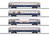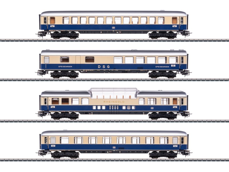 Vorbild: 4 vierachsige TEE-Reisezugwagen unterschiedlicher Bauarten der Deutschen Bundesbahn (DB). Kobaltblau/beige Rheingold-Farbgebung. 1 TEE-Großraumwagen Ap4üm-62, 1. Klasse. 1 TEE-Speisewagen WR4üm-64, 1. Klasse. 1 TEE-Aussichtswagen AD4üm-62, 1. Klasse. 1 TEE-Abteilwagen Av4üm-62, 1. Klasse. Betriebszustand um 1962.